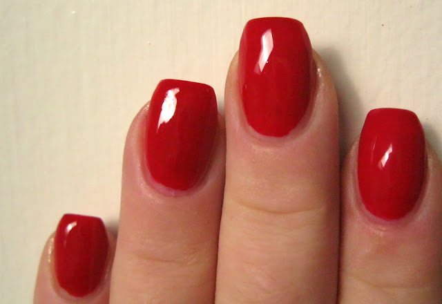 Application of Pillar Box Red was great. It has a light and liquid consistency, enough so that if you're prone to the occasional flourish while applying, as I now realize that I am, you might want to pay close attention to your brush wielding because the feel is a tad slippery. You know what I mean, right? It also seems to be slightly prone to bubbling with thick coats, but the consistency makes it easy to apply thin ones. Pigmentation is awesome -- this polish could easily be a one coater. Pillar Box Red dries in good time to a glossy finish.