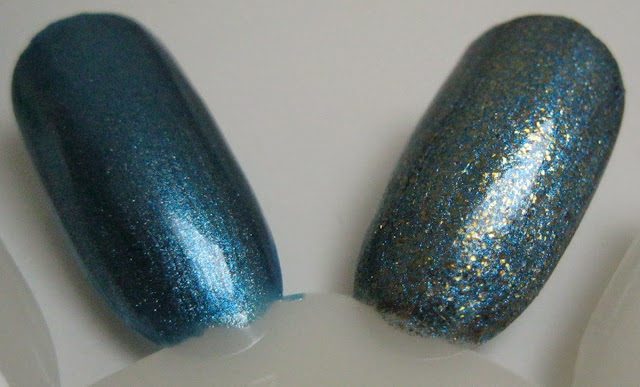 You can really see the similarities in color here as well as the difference in shimmer size; Crystal has larger, chunkier shimmer particles and an especially speckled look due to the golden shardy bits. They are both beautiful polishes though, don't you think? Despite the close color resemblance, to me they are more different than they are similar and speaking for myself, I need them both!