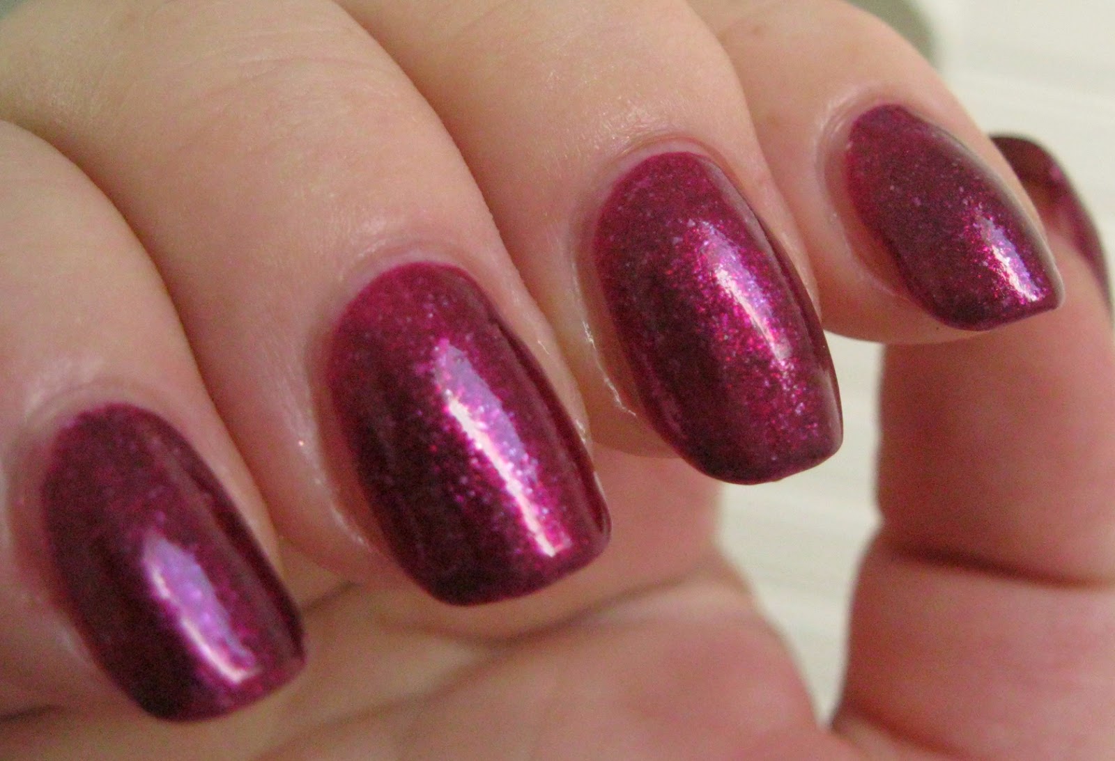 Very pretty! I love the jewel-toned look of this polish in full sun, it has that lit from within look with a bright splash of magenta sparkling with flakies along the axis of light deepening to a rich blackened red-violet along the edges. It's classy, feminine color that transcends seasonal wear, with a sophisticated wine-colored glow indoors in low light and a brilliant flash of pinkish purple outside in the sun. love, Liz