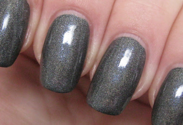 I have two other A-England grey scattered holographic polishes in my collection, Fated Prince and Ascalon. Of the two, Ascalon is closest to Jane Morris, with a similarly-toned rich charcoal grey base and added shimmers. Ascalon's shimmer is royal purple, with effects that are slightly more manifest than Jane Morris, whose shimmer is more subtle and of a much bluer shade of violet in comparison. Fated Prince is also a deep grey, but much more warm-toned than Jane Morris, and it lacks the addition of shimmer. Dorian Gray is another shimmery deep grey A-England polish that's a favorite of mine, a charcoal infused with ultrafine golden particulate shimmers that give it subtle sepia overtones. Even though it is not holographic, it rubs shoulders quite comfortably with these other creations in grey, which are an excellent display of Adina's skill at varying adaptations of this shade to nail polish.