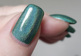 Application was delicious. The consistency of Clover Shield is fluid, smooth and dense with a medium viscosity and a creamy, self-leveling glide over the nail that has a satisfying bit of pull to it. Pigmentation is outstanding with wearably opaque one-coat coverage and full, rich bottle color in two coats. Cleanup is surprisingly easy for this sort of hue, with no pigment travel or residual staining to speak of. Clover Shield dries naturally in very good time to a smooth shiny finish. Topcoat does not inhibit the holographic effects of this polish in any way. Photos show two coats of Clover Shield over treatment and basecoat with a topcoat of Seche Vite.
