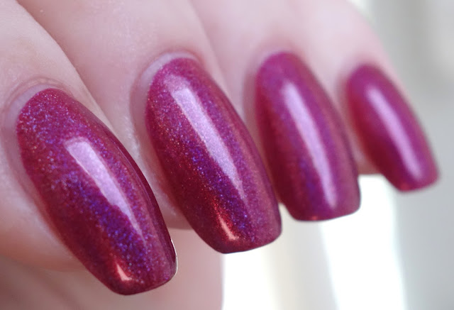 Revival was released in November 2015 by Australian indie polish maker Emily de Molly (EdM). Creator Hayley describes this as a dark pink-based red holo, and I agree. The color is a deep, saturated variation of magenta with aspects of mulberry and raspberry rose, something along the lines of Pantone's magenta or telemagenta from the RAL color matching system. Finely-milled holographic pigment gives it a rich, delicately-speckled, demi-Pointillist appearance and creates shifting hues of violet, wine, deep red and translucent misty lavender pink within the base in ambient light. In the sun, there's a fantastic, fully-linear prismatic display comprising all of the rainbow colors in a sparkling flare around a central lick of gleaming semi-metallic silvery magenta.