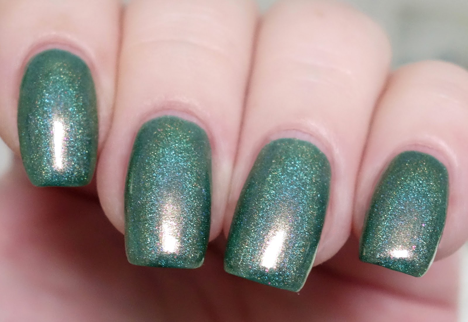 The base color is a cool, translucent, medium-toned shade of Paris green. The degree of translucence creates luminosity and allows the color to be easily influenced by its components, giving it a certain malleable complexity on the nail. Holographic properties nuance the base with aspects of blue-green in ambient light. Abundant fine pink-to-gold color-shifting shimmers combine with it to give it a dusky quality, and create a swath of golden peachy-pink along the axis of light. Tiny, reflective bright pink microflakes emit a stealthy sparkle as light travels over them.